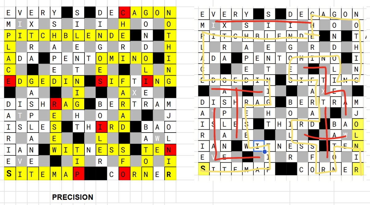 一開始有留意到特別大的格子,只是後來解完所有提示後才聯想到《見證者》。我們很快又發現可以把字母塞進某些黑格內,以組成問號標記的答案。我找了張五連塊的縮寫表,把字母換成五連塊,然後很快就把謎題解掉了。