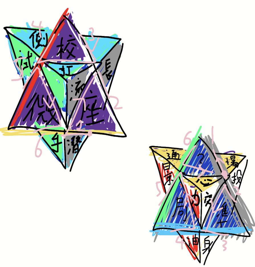 題目很明顯地指向星形八面體,然後就卡了。瞪了一會兒才有「把中心和角進行配對」的想法。雖然題目明確地使用了中文數字,但是還是沒有意識到需要把答案翻譯成中文,要靠人工提示才能繼續解題。