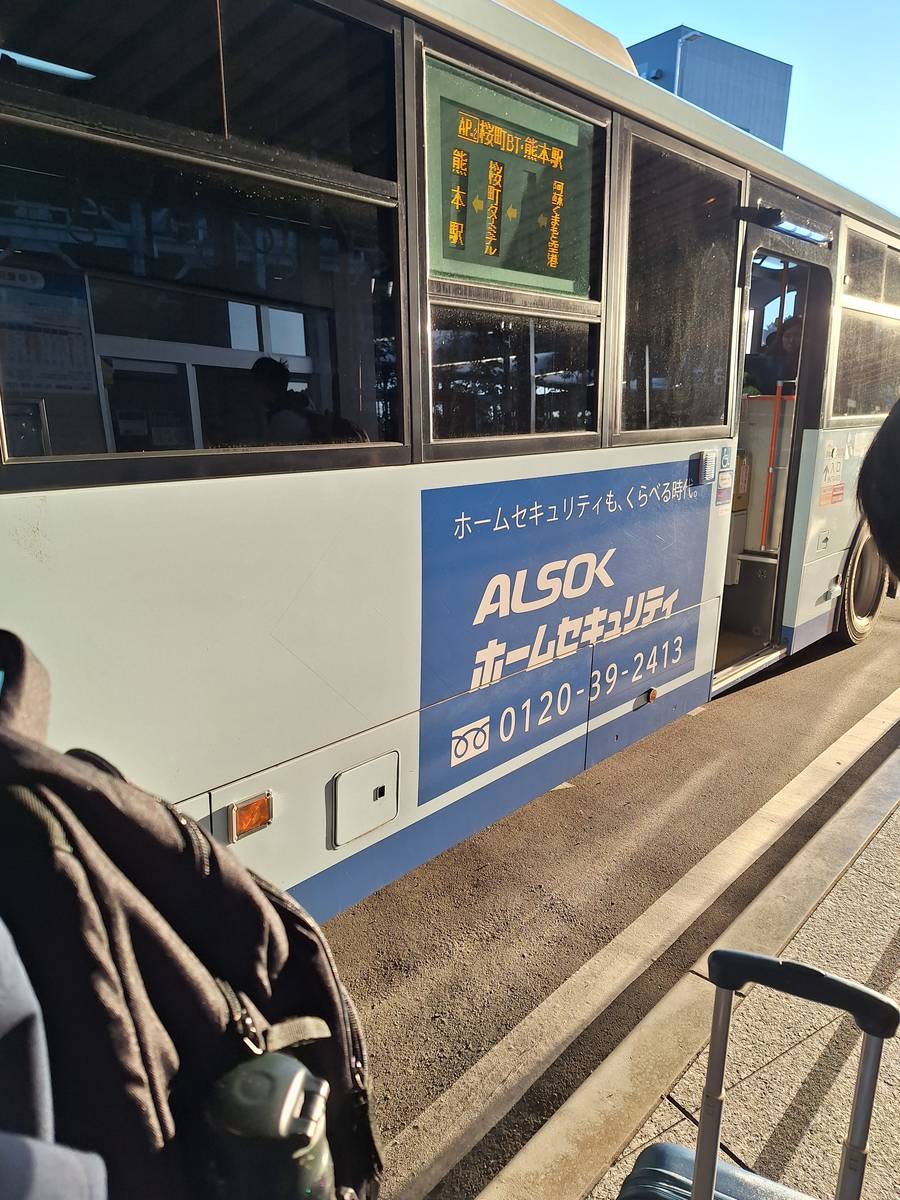 雖然我們在下午便抵達了機場,但是實際上整個下午都浪費在交通上。由於機場距離市中心較遠,交通也不大方便,我們只能靠巴士來往機場和市中心。熊本的大多數交通可以使用西瓜卡(Suica)付款,不過當時我的西瓜卡沒有餘額,所以只能在機場的售票處購買車票。另外,當時的乘客較多,我們剛好上不到第一班巴士,所以只能等下一班。結果,我們花了不少時間才到達我們的落腳點——通町筋。