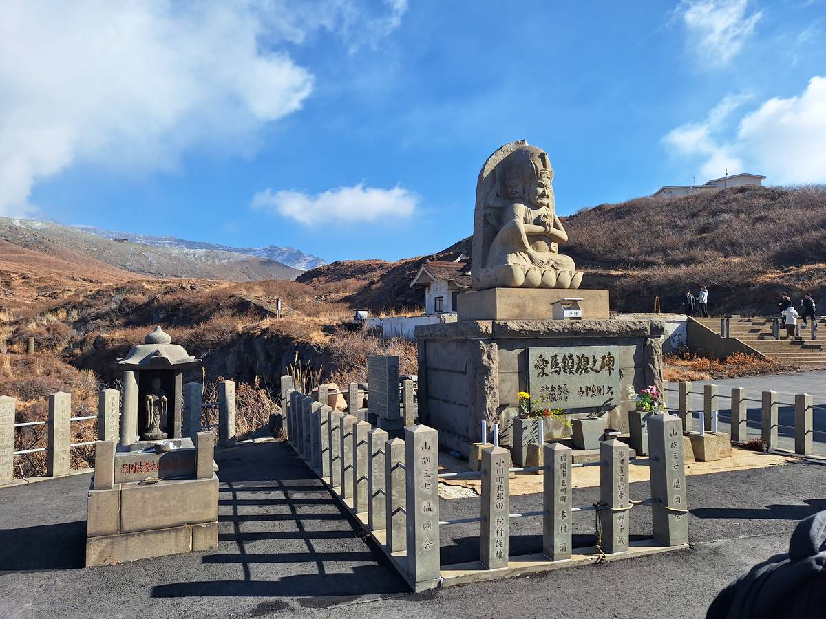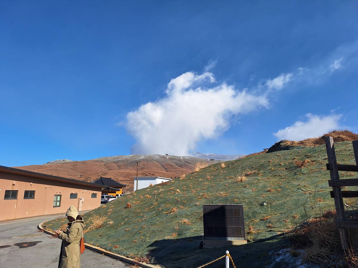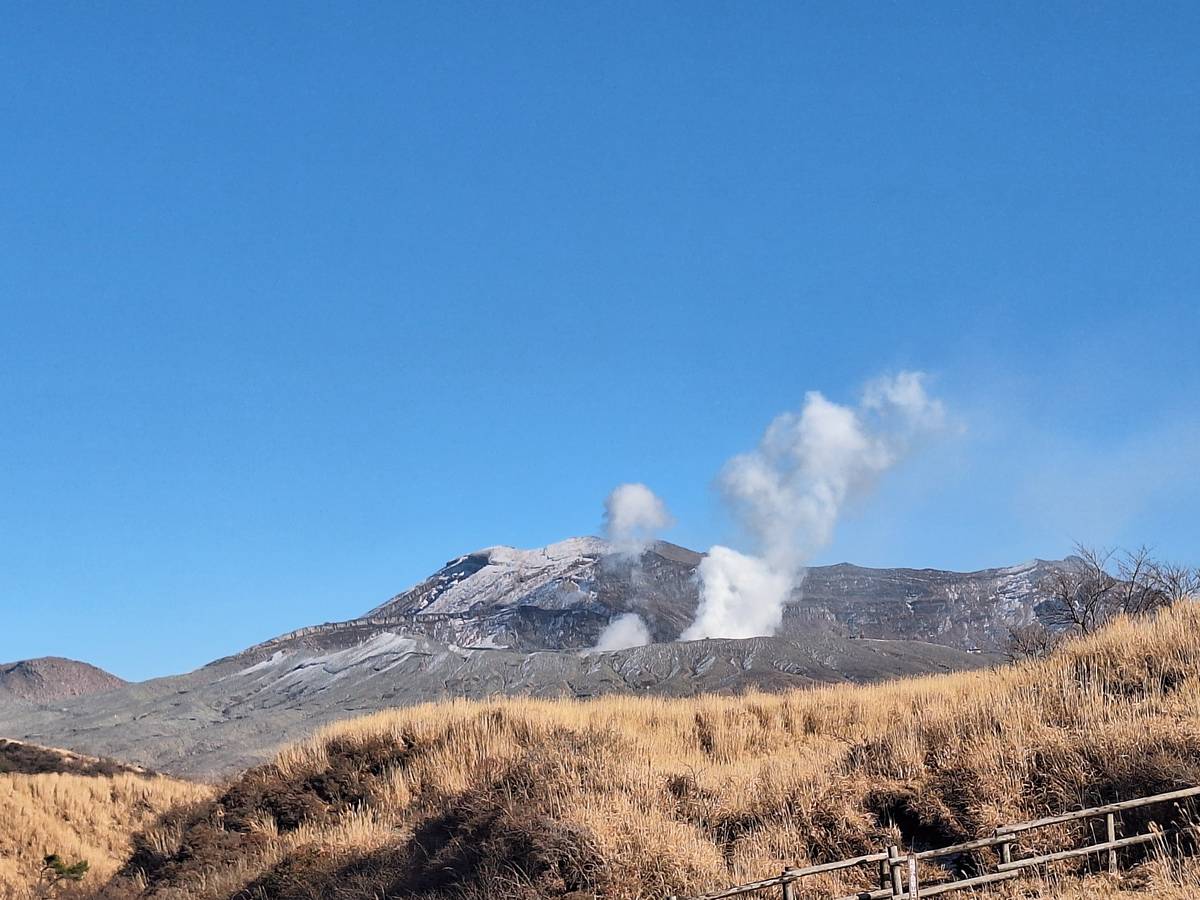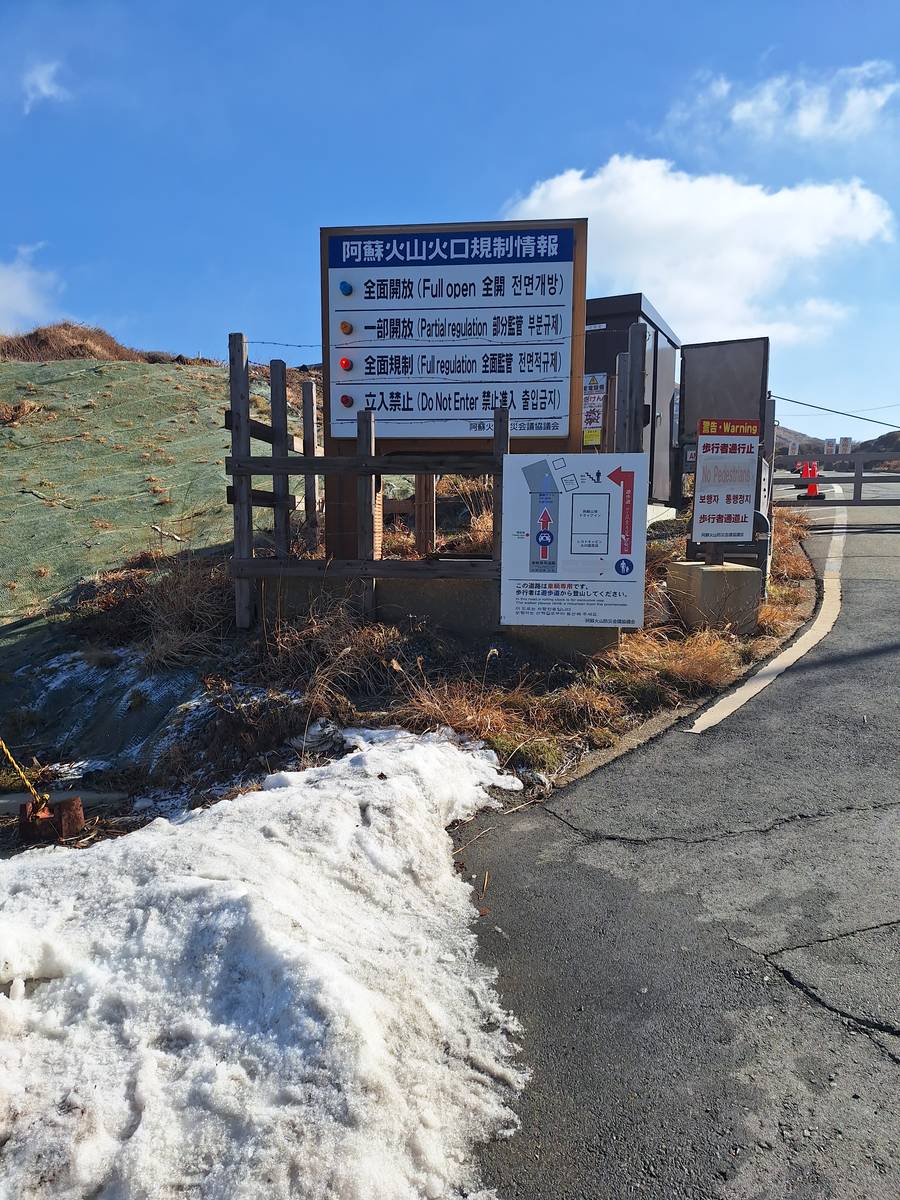 沒錯,火山口附近被封了,自然也看不到火山口。我們只能廣場遙望火山噴出的白煙。我在出發前有看過阿蘇火山的狀態,只不過沒有想到,「全面規制」指的是直接把整條登山道路封掉,真掃興。