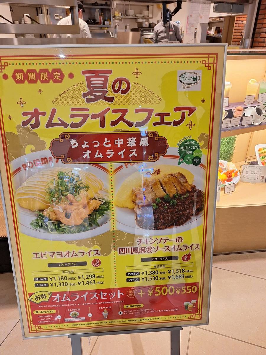 逛完一圈後,也差不多是時候吃晚餐了。我們在同一層找到一家專賣蛋包飯的餐廳。除了普通的蛋包飯外,它竟然有賣「四川麻辣醬切雞」蛋包飯。