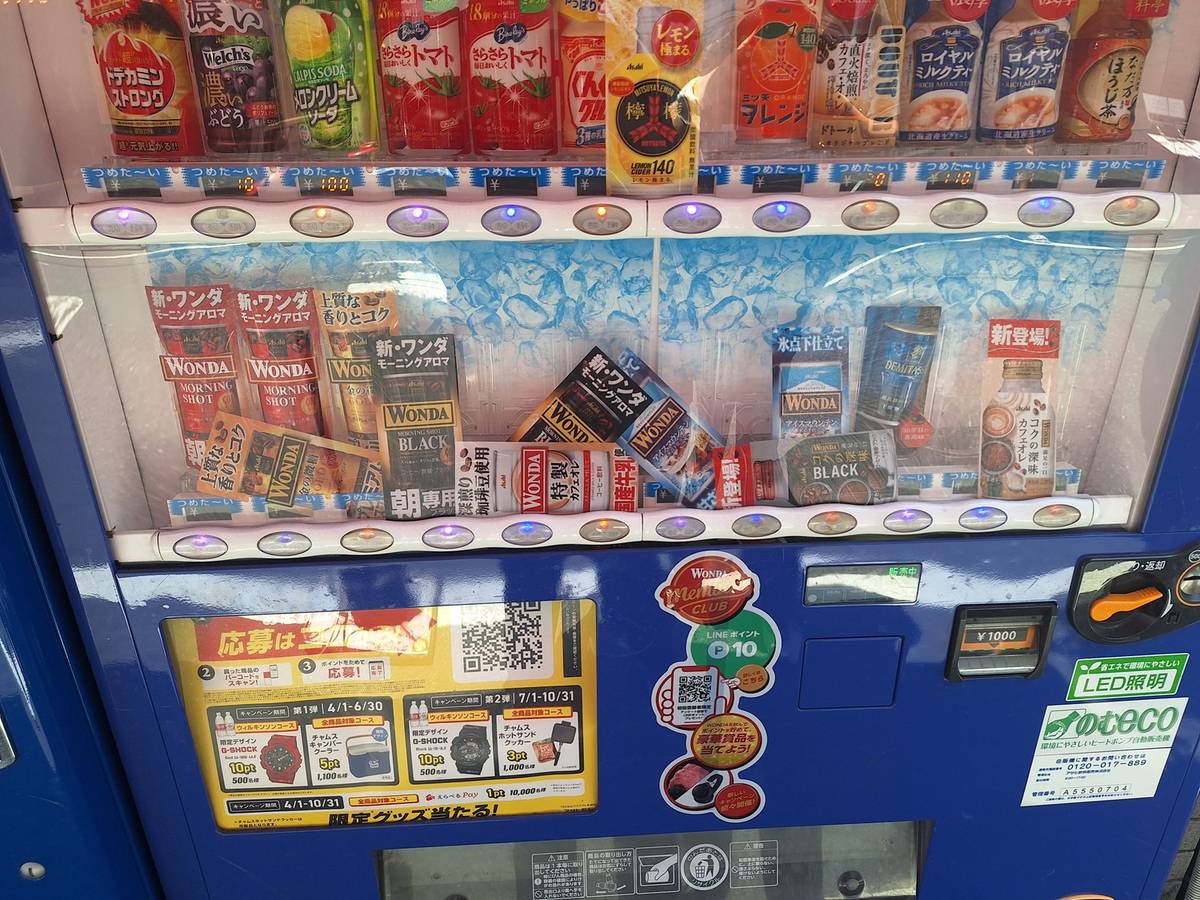 我們沿路還看到奇觀:自動販賣機裏面的立牌全倒了,買飲料就像在抽盲盒。