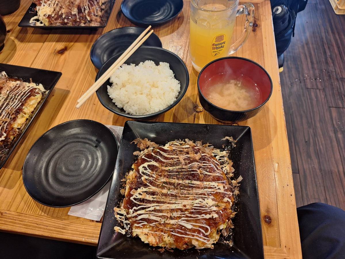 逛了一會後,我們在附近的一家餐廳用膳。餐單上寫着每人最少要點一杯飲品,不過因為這裡是酒場,所以我們也不肯定是真的最少要買一杯飲品,還是只要有消費就好。於是,我們一共點了五份大阪燒和五杯飲品。可能是因為我的日文不夠好吧(還忘記了量詞的發音),五份大阪燒都到齊了,但是只來了三杯飲品和兩杯水。於是,我只好再呼叫店員,然後再加一杯飲品(因為有一個人表示不用點飲品),順便確認那兩杯透明液體是水(因為我們是在酒場裏面,以免喝到酒)。雖然在溝通上還不完美,但是最終還是順利地用日文點了餐。