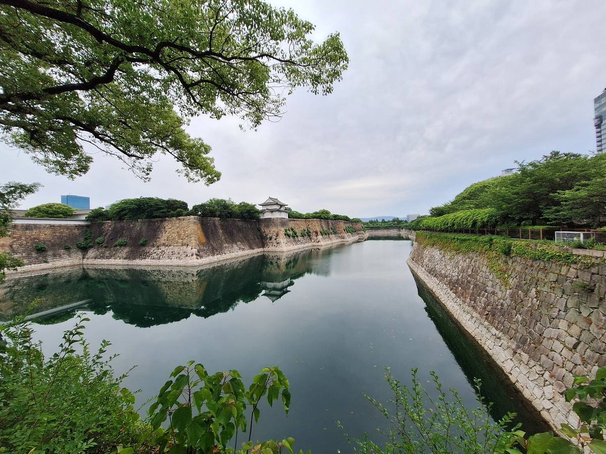 接下來,我們才踏進大阪城附近的綠地。向着大阪城的方向望去,就可以見到一條寬闊的護城河。