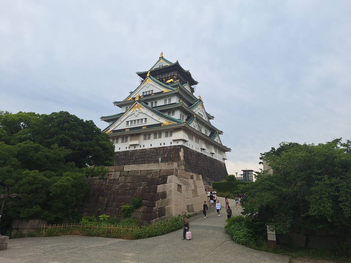 從豊國神社再向着北走一段距離,穿過櫻門,映入眼簾的便是大阪城。大阪城的屋頂由薄荷綠的屋瓦覆蓋着,和金色的裝飾成對比,顯得整座城格外漂亮。