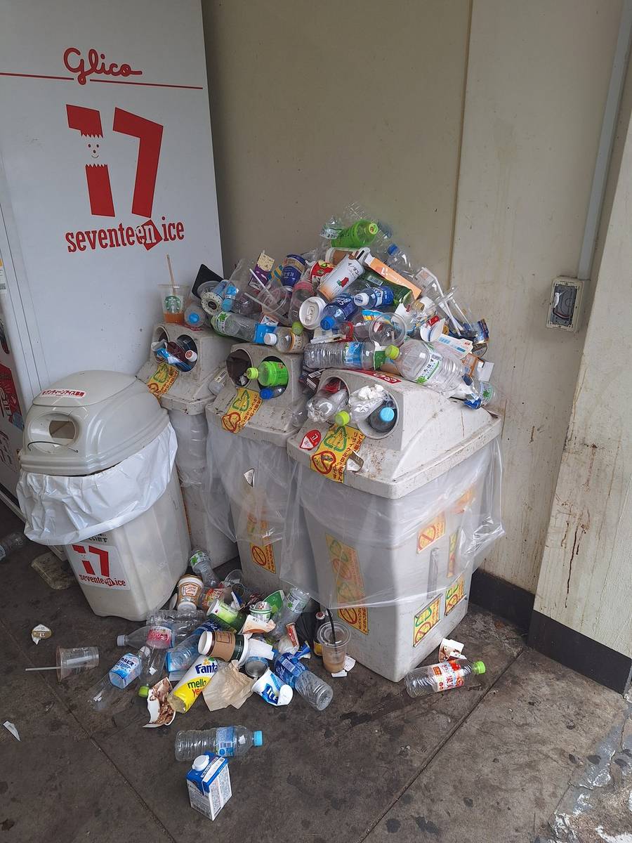 我在附近的自動販賣機看到堆積如山的垃圾,看來這就是過度旅遊的壞處之一。