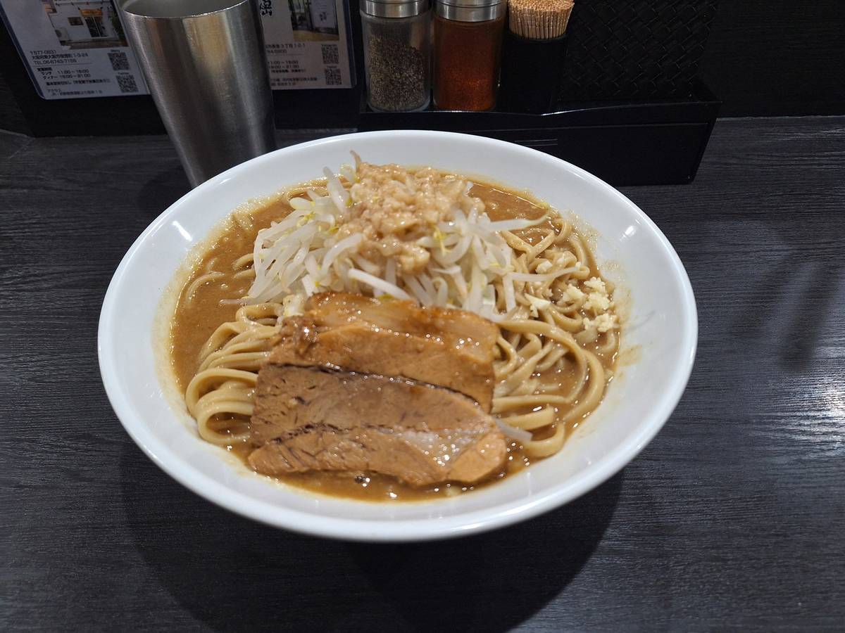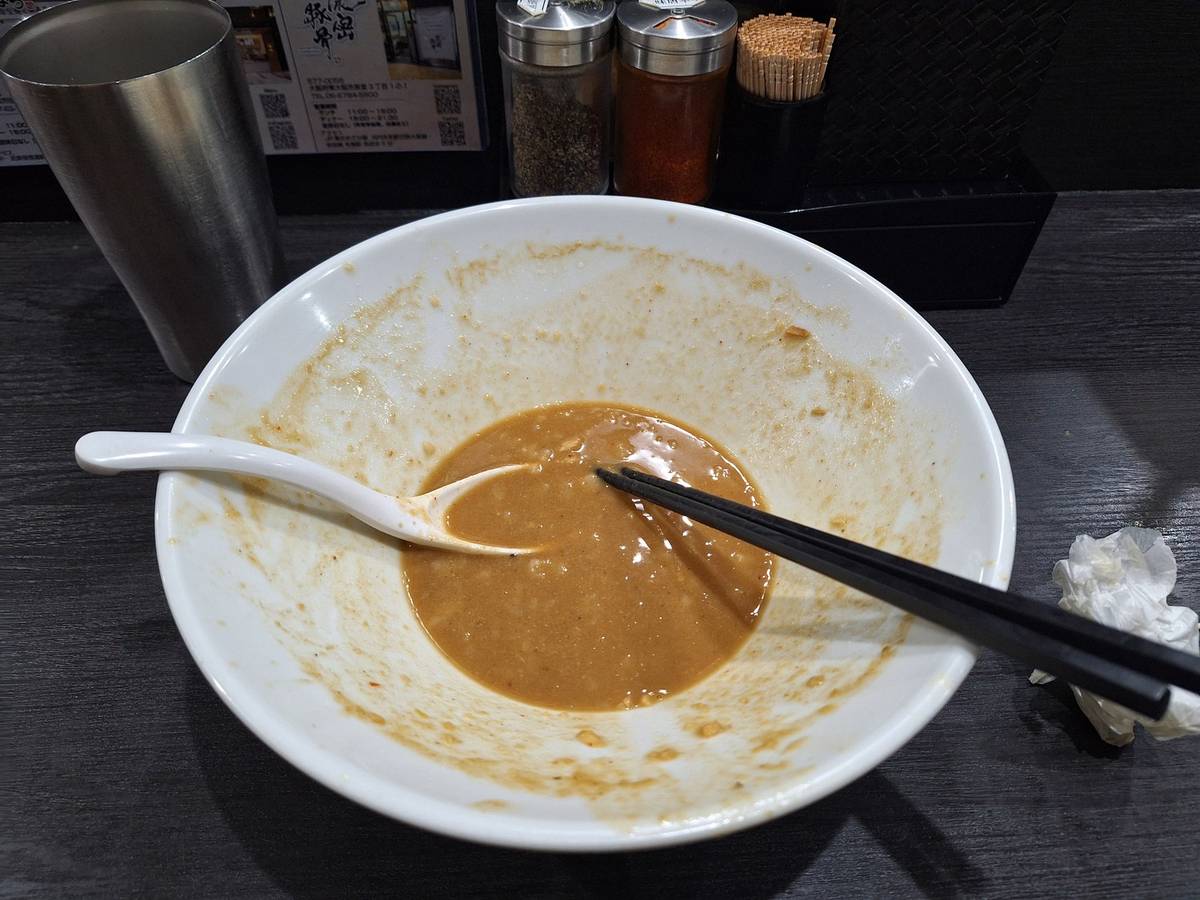 Tommy在地圖上標註了兩家餐廳,其中一家是他網友推介的一家拉麵店,除了拉麵之外還有賣沾麵、乾麵。我們到達拉麵店後,由於店內不夠位置,所以我們在買了食券之後,店內的員工便安排我們在店外排隊。店員還問了我們配料的份量,不過由於語言不通,所以最後還是要用Google翻譯才可以順利溝通(原來店員在問我們芽菜和大蒜的份量)。