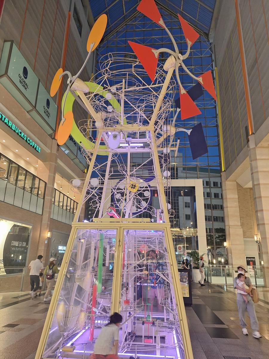 用餐後,我們在返回神戶站時經過一個中型滾珠裝置。裝置的上半部分使用較輕的塑膠球,下半部分則利用桌球觸發聲響。很可惜,下半部分的一部分機關壞掉了,無法成功觸發。