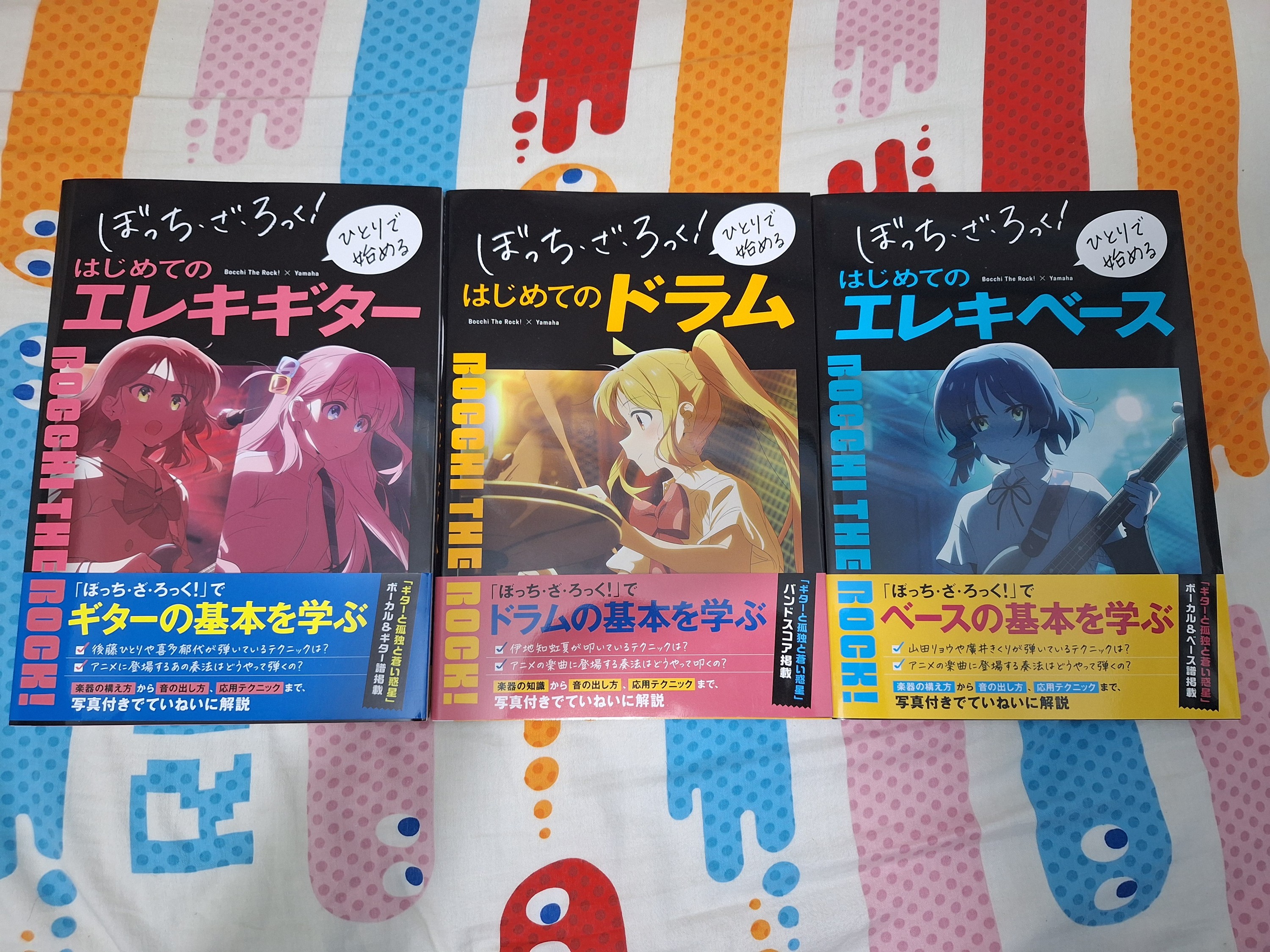 這次去買了這三本書,三本都是新手向的教學書。封面的角色和書的相關樂器一一對應,分別是一里/喜多(電結他)、涼(貝斯)和虹夏(鼓)。