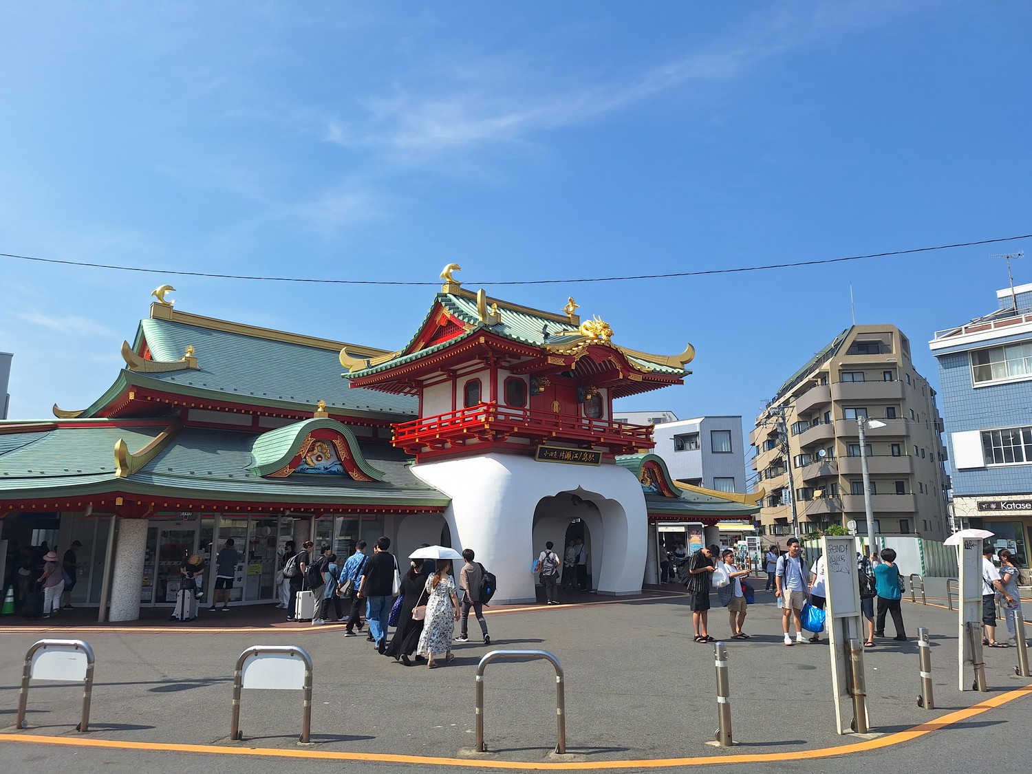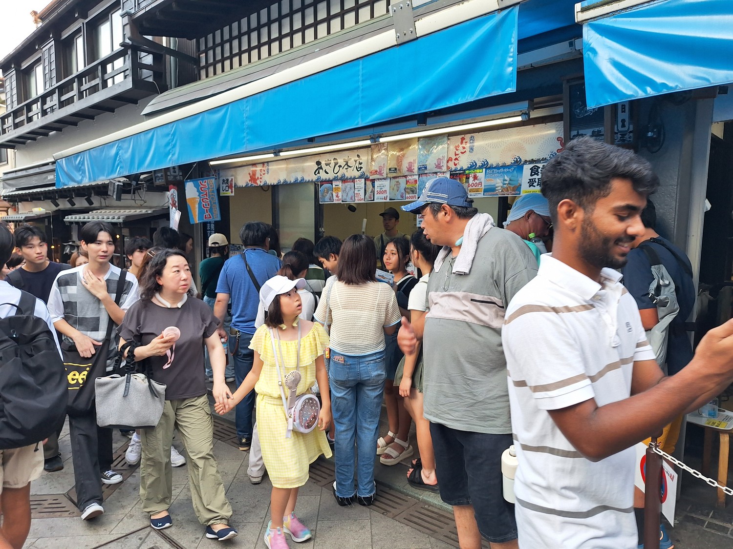 江之島的商店街很多人,塞得水泄不通。位於後端的「丸焼きたこせんべい あさひ本店」更是大排長龍,我見到有這麼多人在排隊就沒買了,只拍了照片就繼續向上走了。