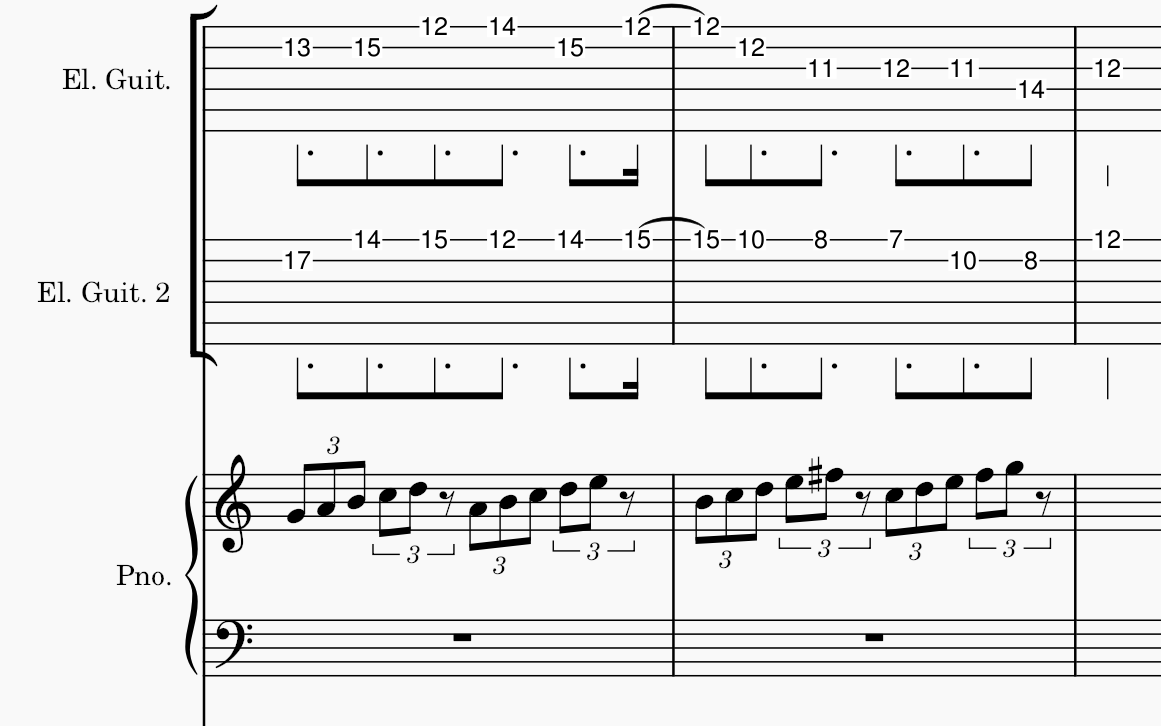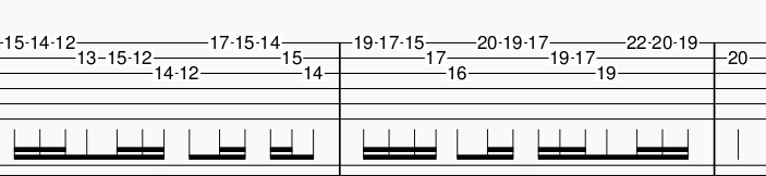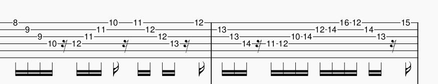 16分音符中混雜了16分休止符。雖然這裏仍然是4/4拍,但是完全聽不出重拍,彈奏的時候也很容易數錯拍子。「多個16分音+16分休止符/單個8分音符」的節奏在這首歌很常出現,例如1:20的Bridge: