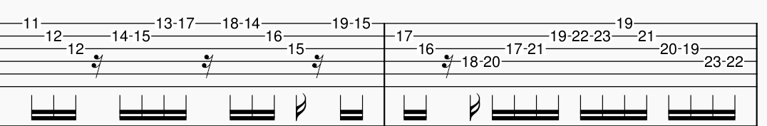 這一段很工整,長度剛好兩個小節,但是我聽了好幾次才能夠數好這一段的拍子。我們可以看到山本真央樹是真的想要弄死所有玩家和結他手。